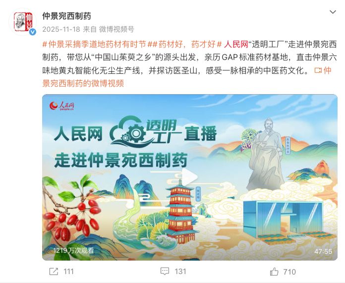 首先是秋天交出的“透明答卷”。品牌在伏牛山腹地发起“仲景采摘季”溯源直播,同步上线话题#仲景采摘季道地药材有时节#。没有滤镜与渲染,镜头真实记录下了药农依照古法、顺应节气采收药材的全过程,并无缝衔接至现代“透明工厂”的精密流水线。